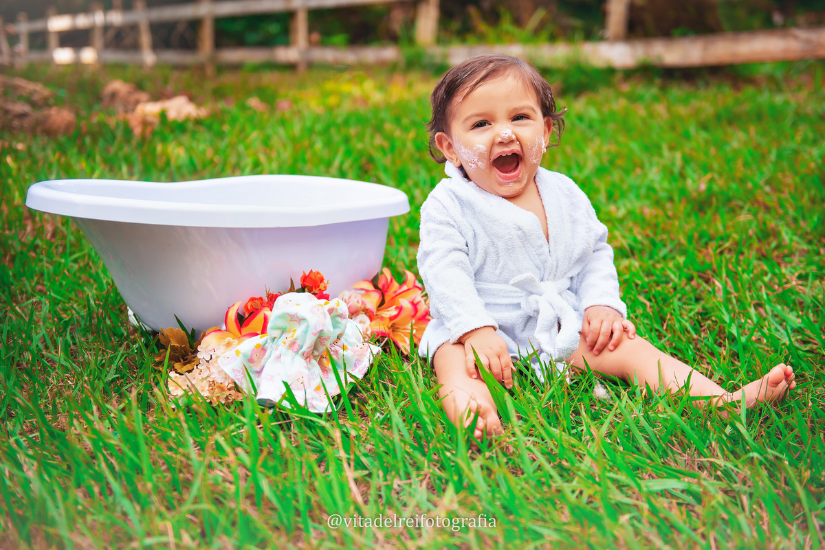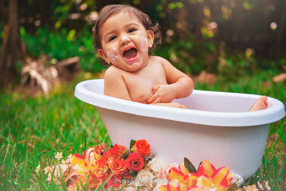 Foi um mix de ensaio. Começamos com um ensaio de família, passamos para o ensaio Smash the Cake, que muitas crianças adoram e se lambuzam e terminamos com um delicioso ensaio na banheira. Um banho delicioso e quentinho, que além de limpar o bebê, faz a alegria dele. Meu Deus, como as crianças gostam de água.